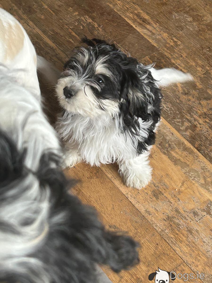 We are pleased to offer a charming litter of Cavachon puppies, now available for loving homes. These adorable puppies, aged just a few months, consist of four males (Black/Tan, Cream, Black/White, and another Black/White). Known for their affectionate nature, Cavachons are a delightful crossbreed of the Cavalier King Charles Spaniel and the Bichon Frise, making them gentle companions that thrive on human interaction. This breed typically exhibits a playful disposition and a strong desire to please, which makes them excellent family pets.