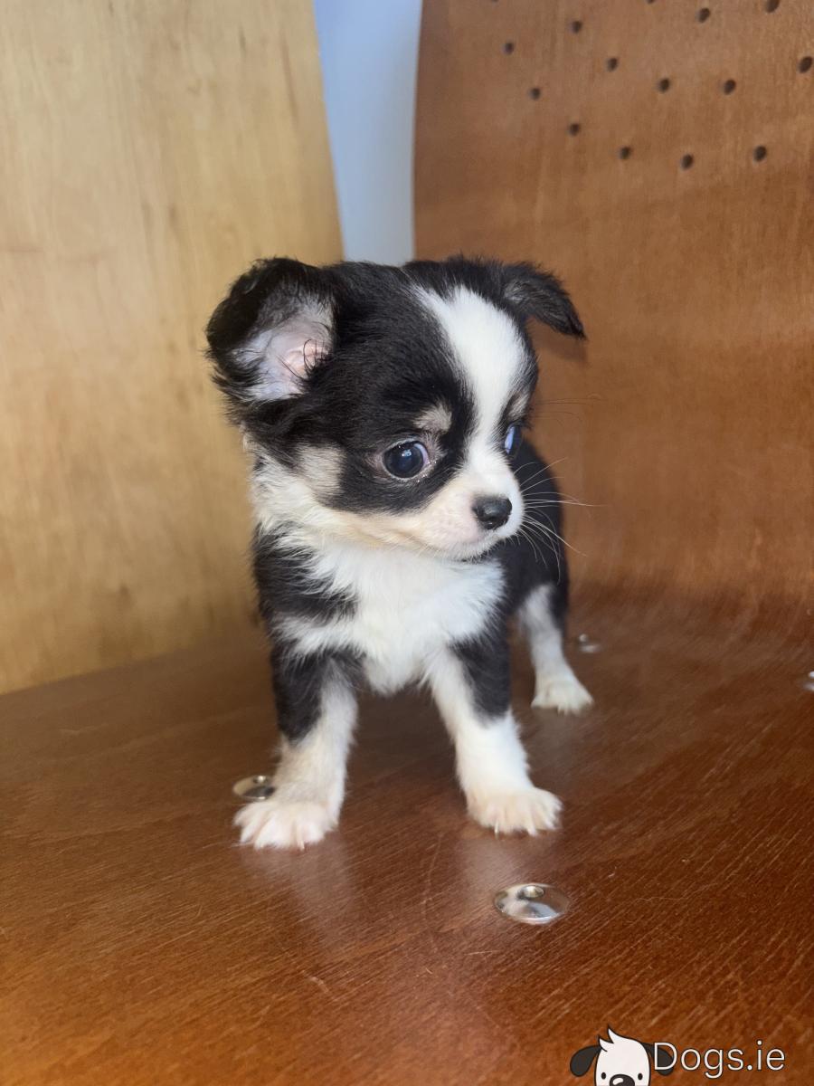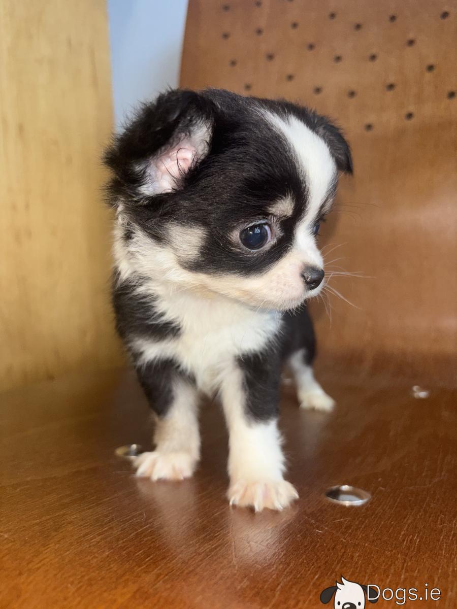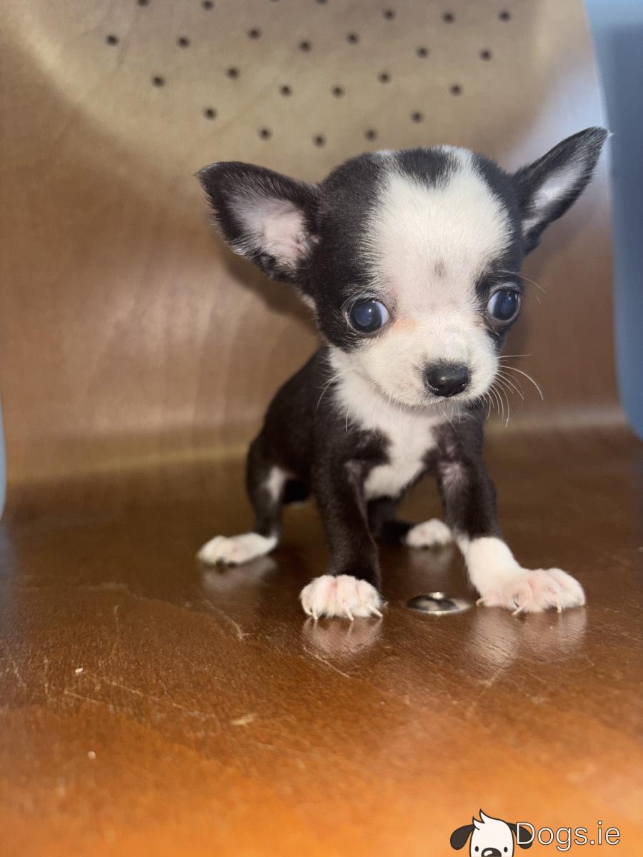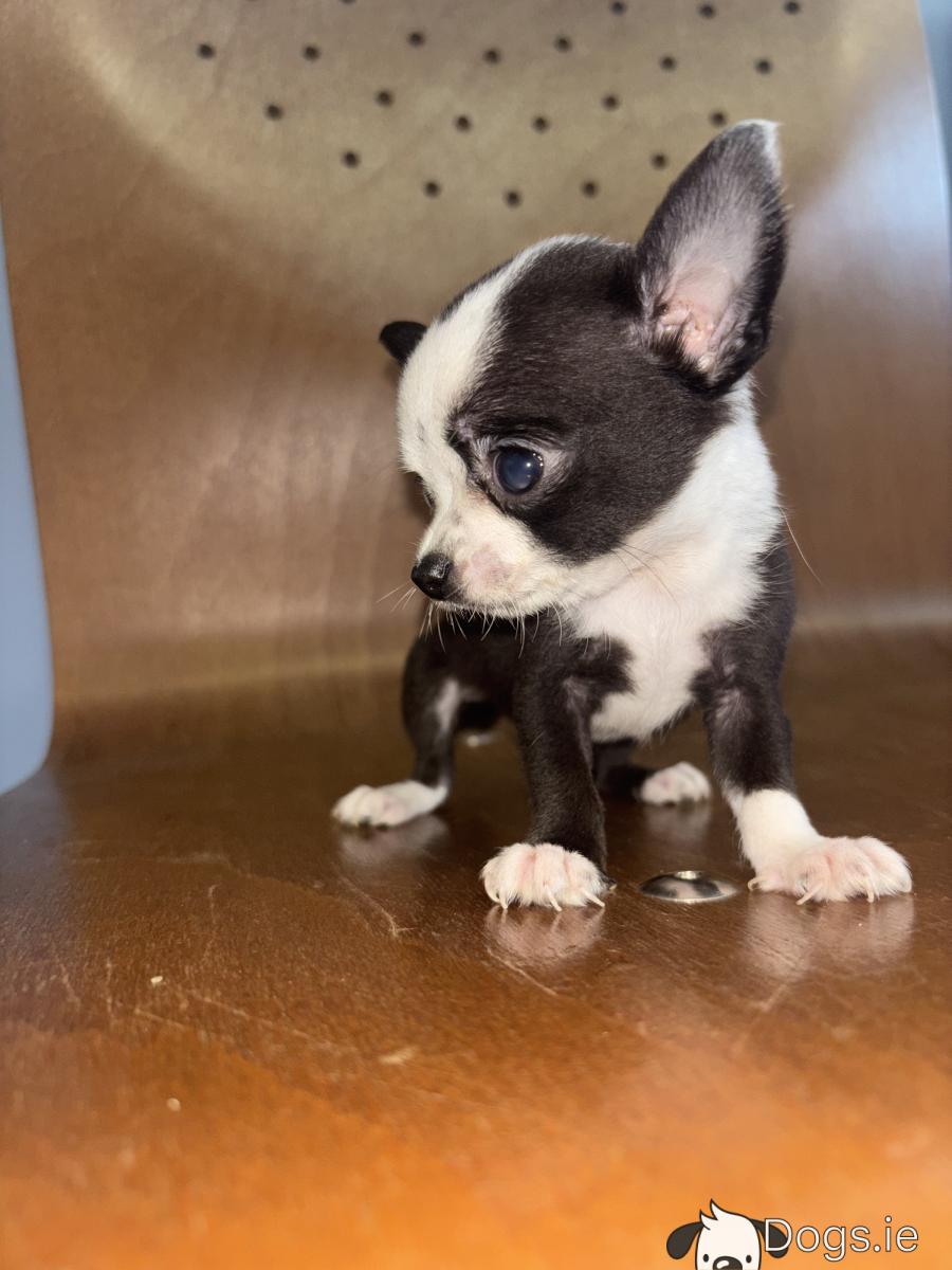 We have a lovely selection of Chihuahua puppies available for sale. These puppies, aged just over 2 months, include a friendly male in black and white and a beautiful female in a unique blue (Kerry/Merle/Roan) coat. All puppies are vaccinated and wormed, ensuring they are healthy and ready to join their new families.