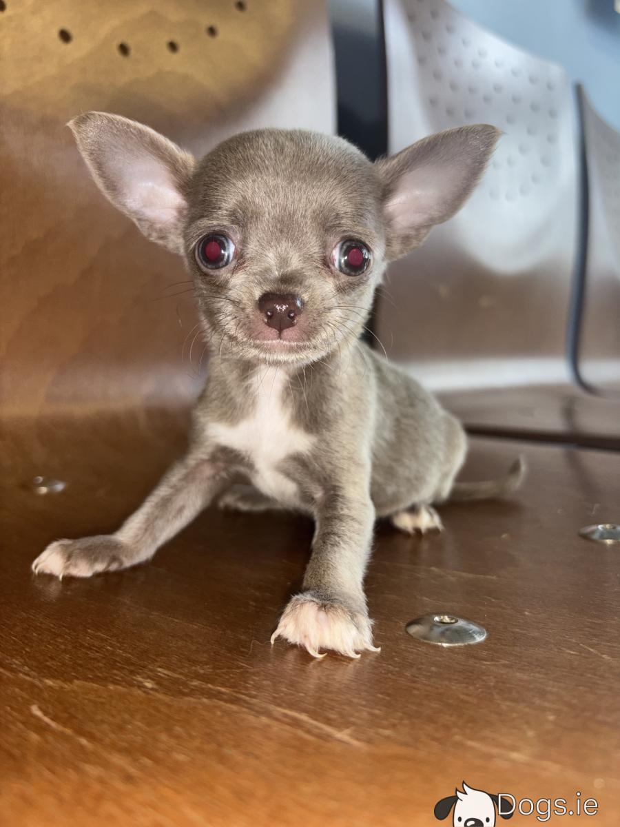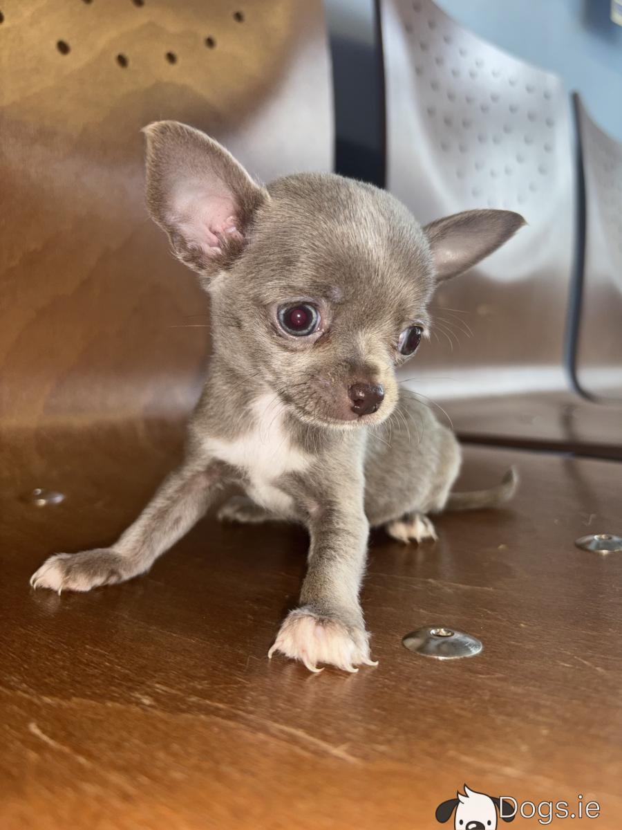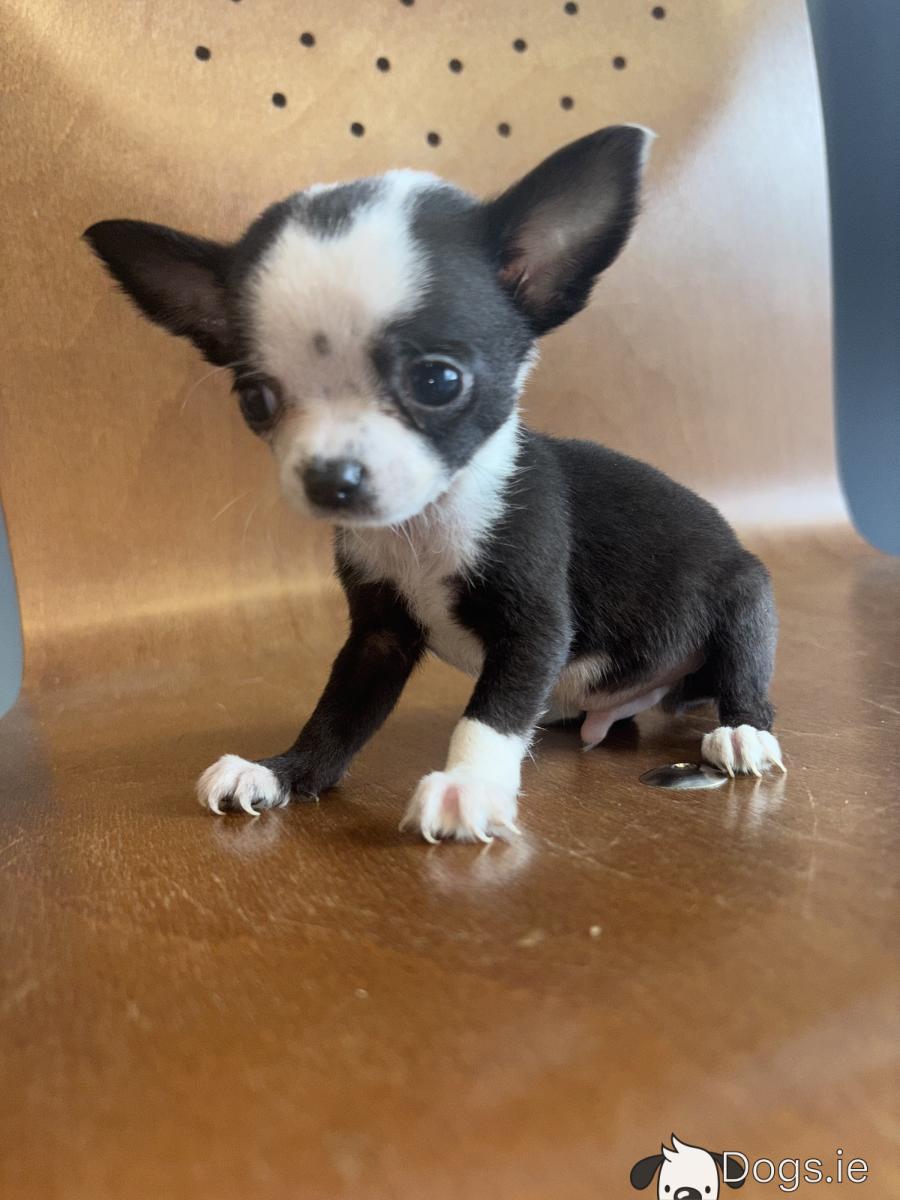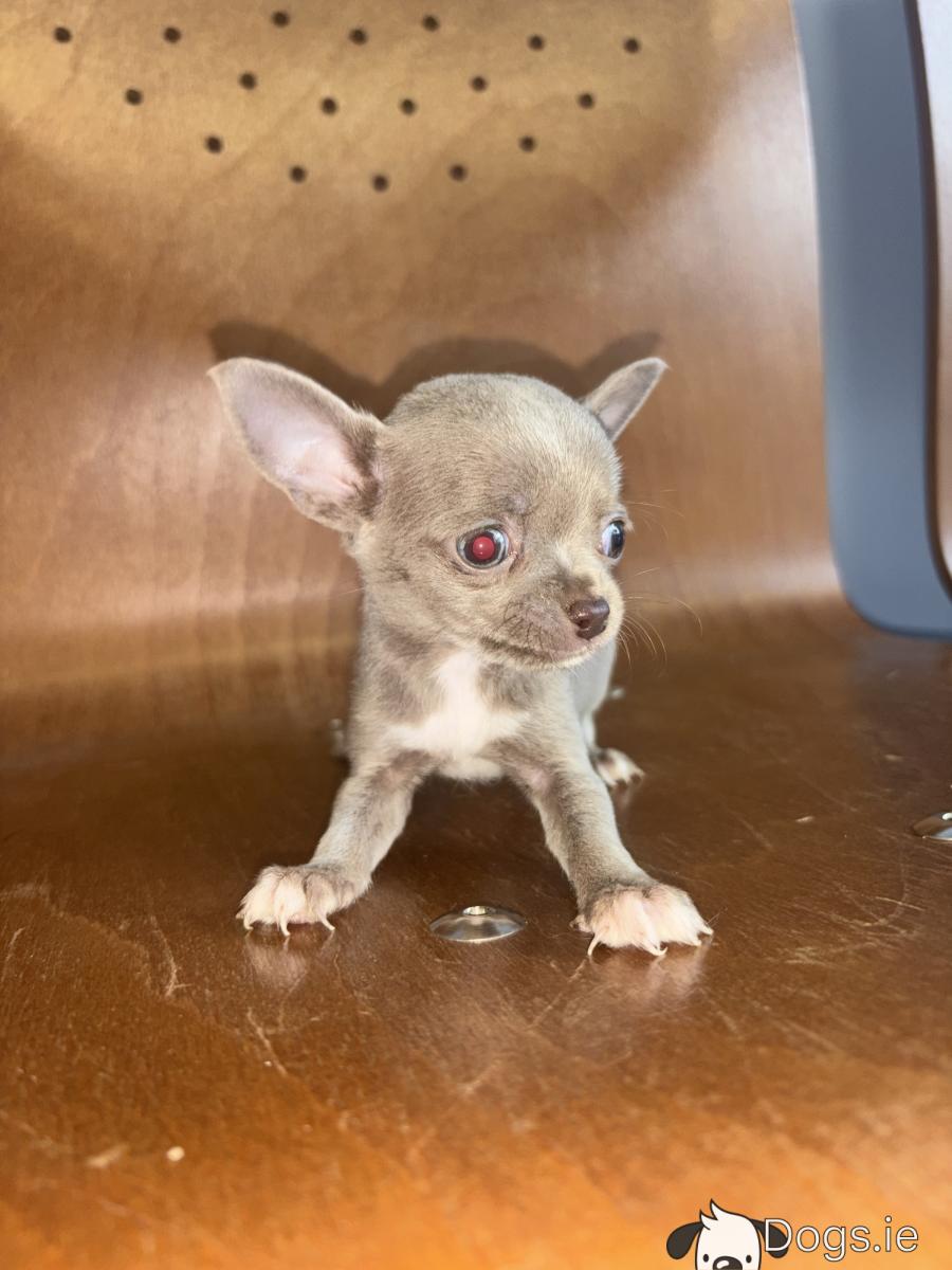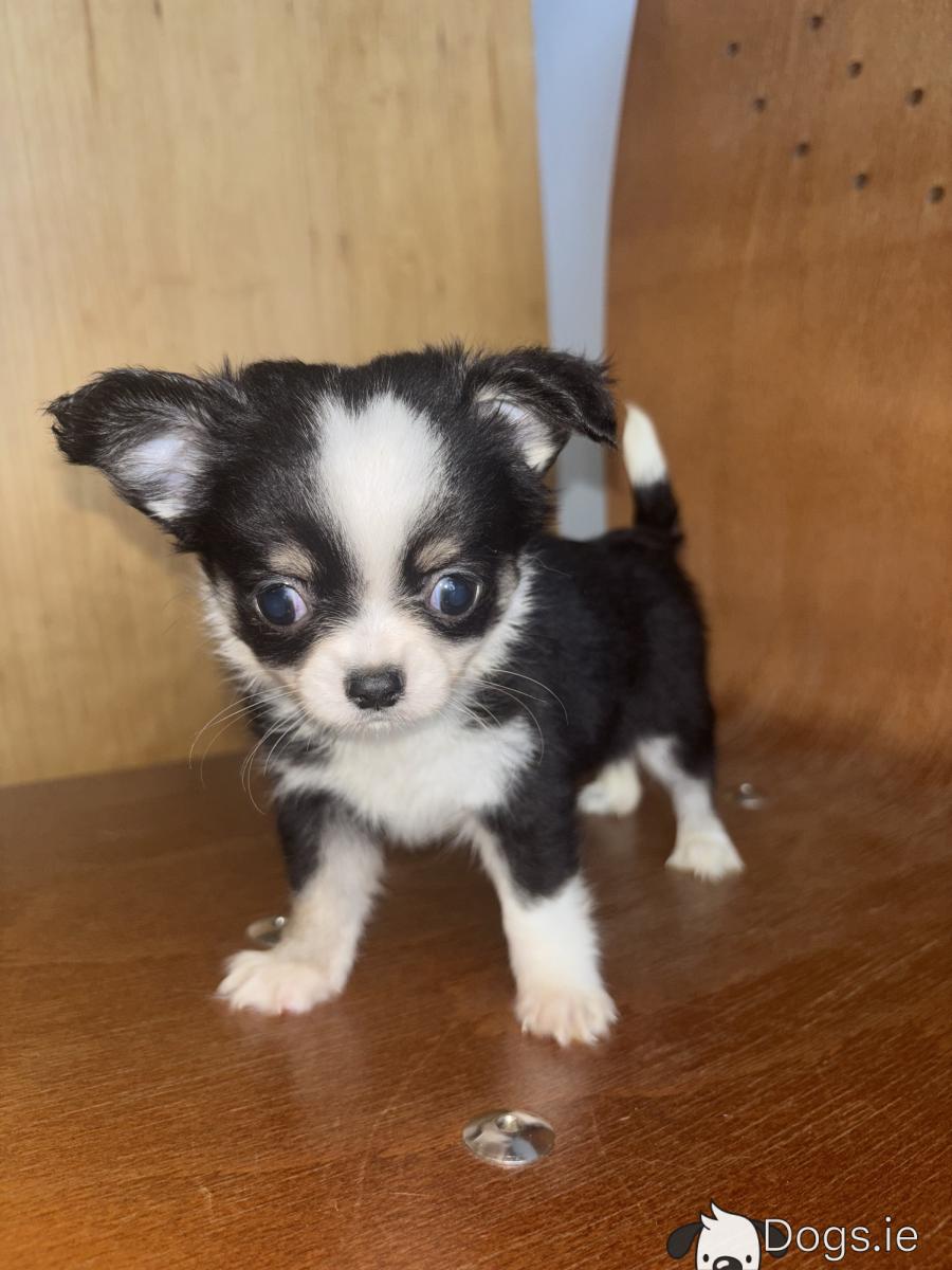 We have a lovely selection of Chihuahua puppies available for sale. These puppies, aged just over 2 months, include a friendly male in black and white and a beautiful female in a unique blue (Kerry/Merle/Roan) coat. All puppies are vaccinated and wormed, ensuring they are healthy and ready to join their new families.