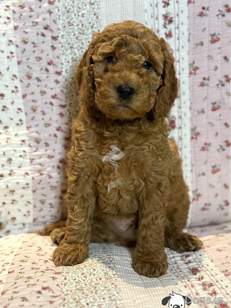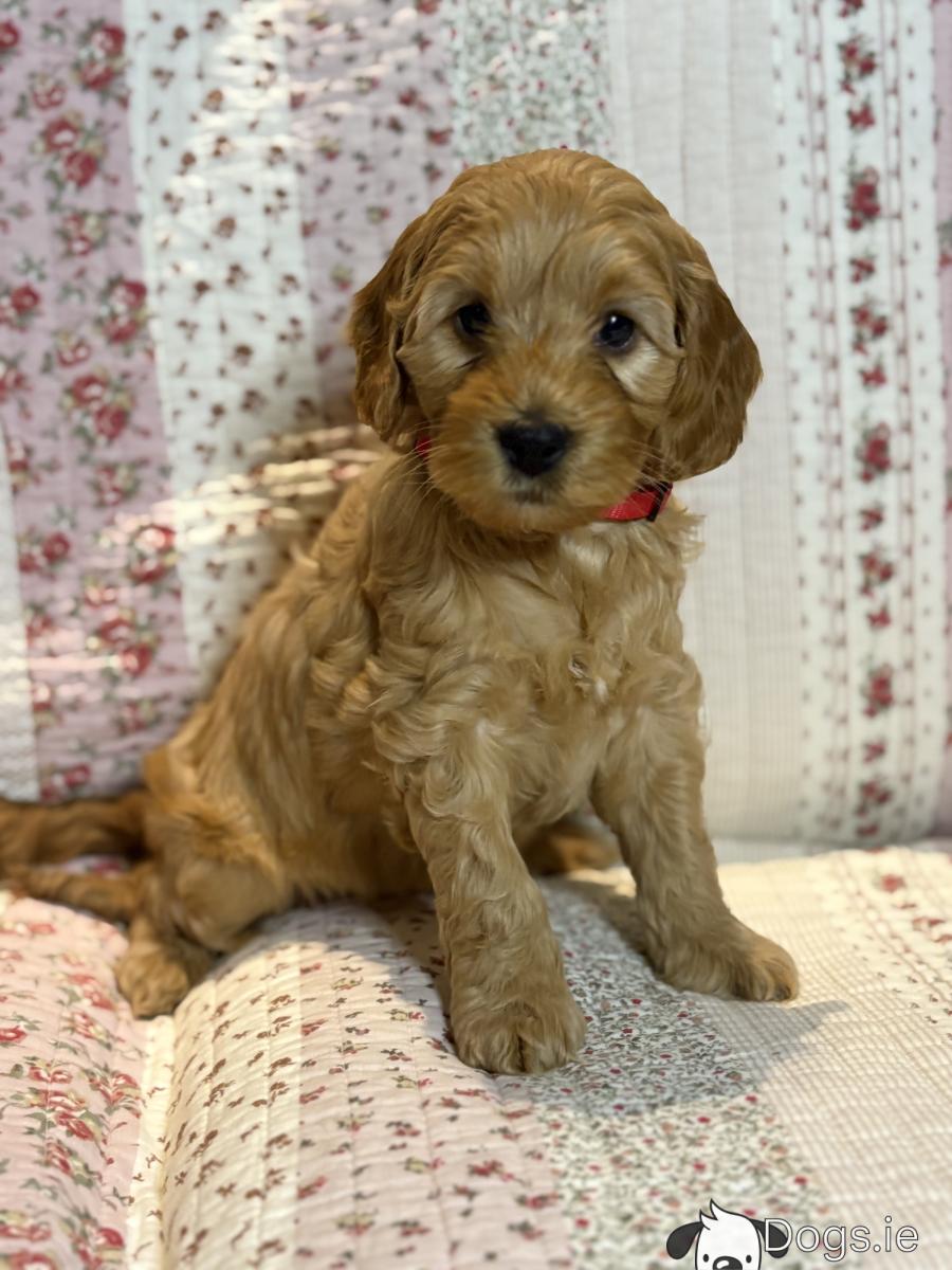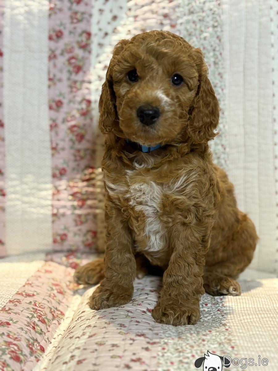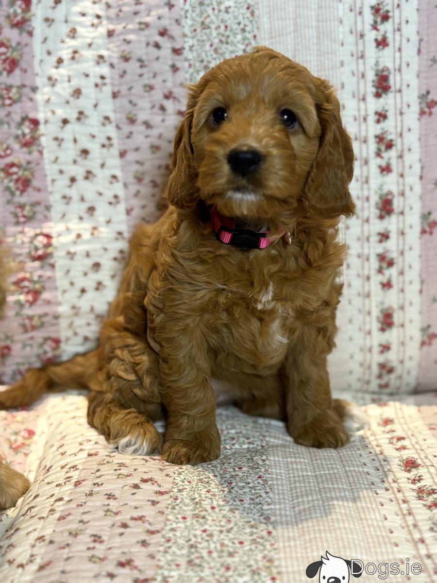 We have a beautiful litter of 4 Cockapoo puppies available for sale. 3 male & 1 female. Mum is our loving pet Cockapoo Maggie & Dad is a red poodle. This is Maggie’s 1st litter of puppies & they have been reared with love & lots of affection from us & our children so they will be really lovely little family pets. They are a beautiful apricot / red colour with some having some white patches. Cockapoos are wonderful pets as they are intelligent, loving, loyal & very easy to train. They are playful yet gentle which makes them great with children. Their non-shed coat makes them an ideal house dog. These are pure quality puppies & will be a fab pet for any age.