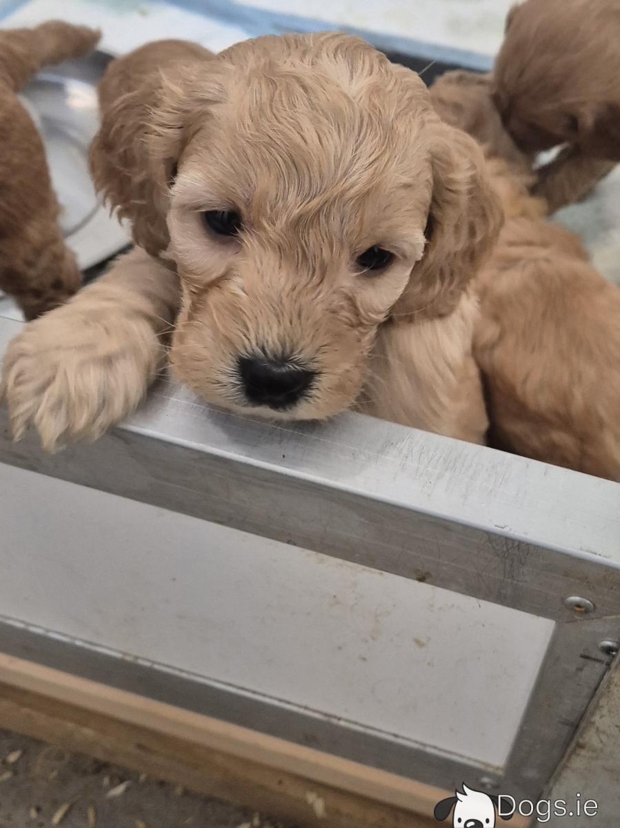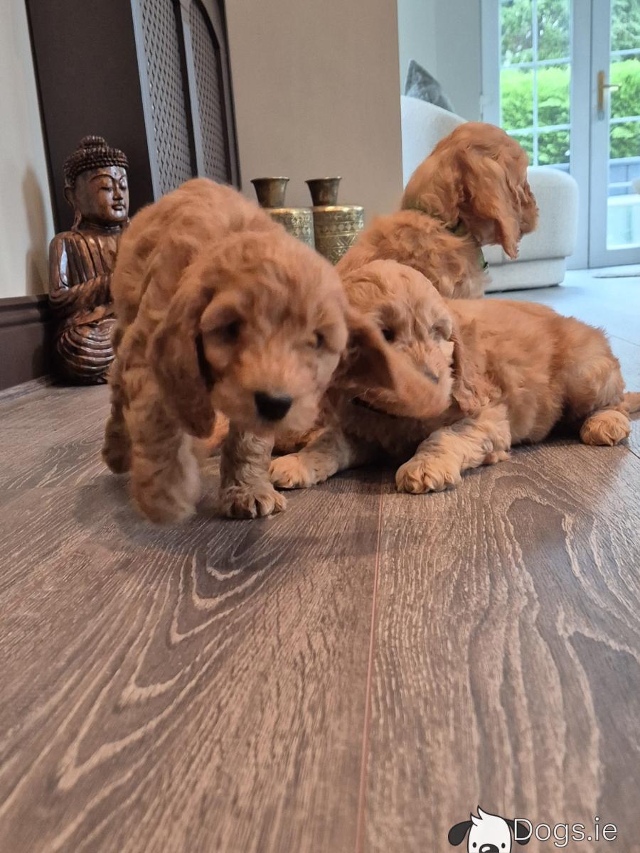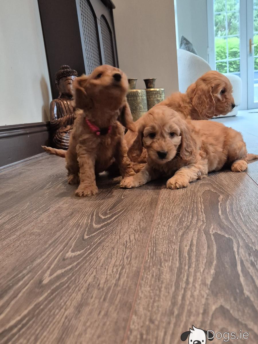 Beautiful litter of apricot & red, non shed, hypoallergenic Cockapoo puppies. Dad is an apricot miniature Poodle, Mum is a red Cocker Spaniel. Both are family dogs and can be seen with the puppies.