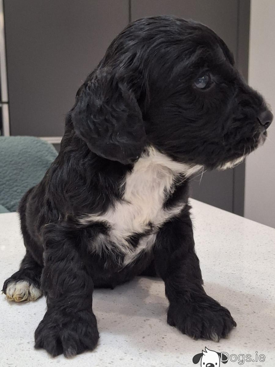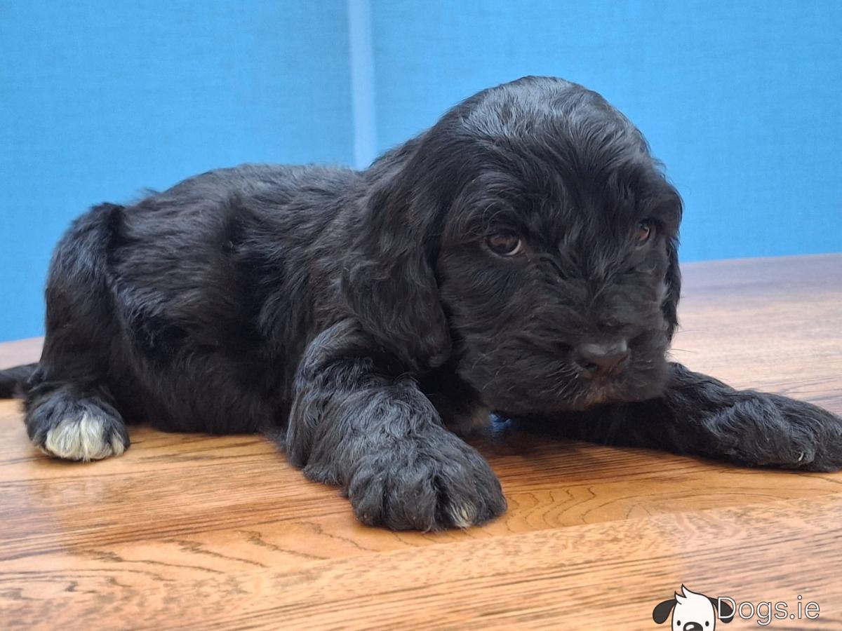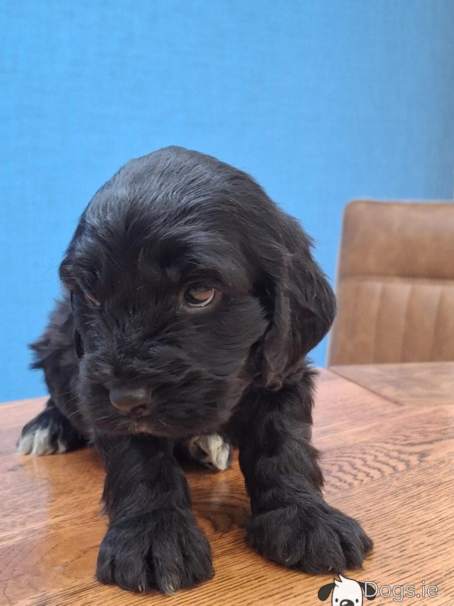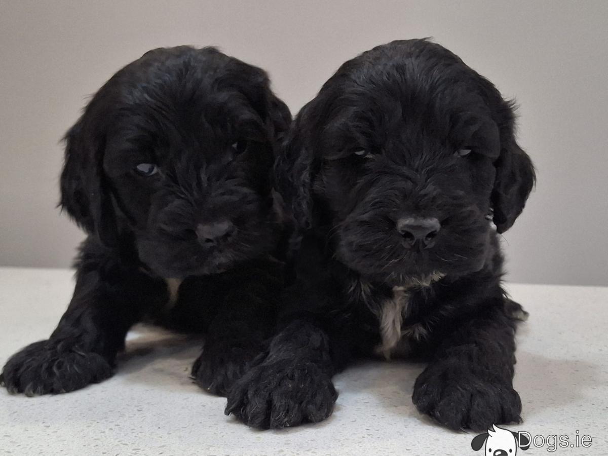 Mini black Cockapoos, Dad is miniature Poodle and Mum is a Cocker Spaniel, they are both family pets. These little guys have been microchipped, vaccinated, wormed and flea treated and will have all their certs. They have been reared in the family home and around children and are well socialised. They will have beautiful wavy curly coats and very affectionate temperaments. Please contact 0874088908 for more info.