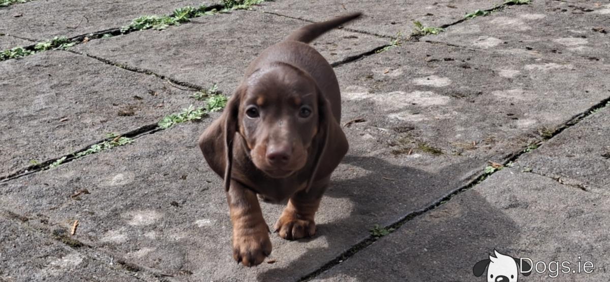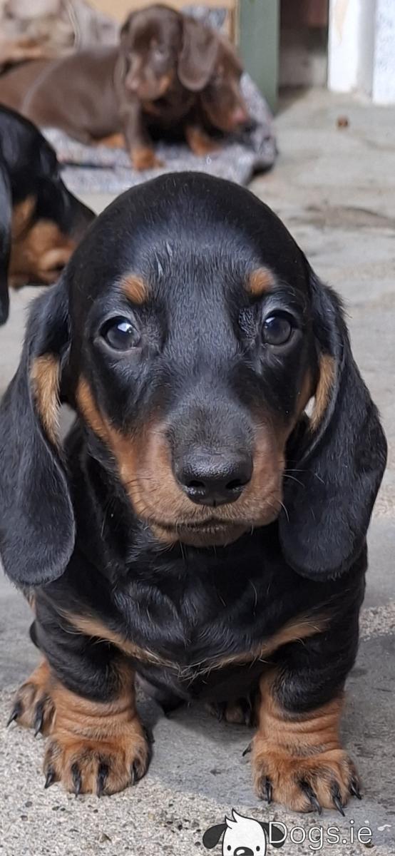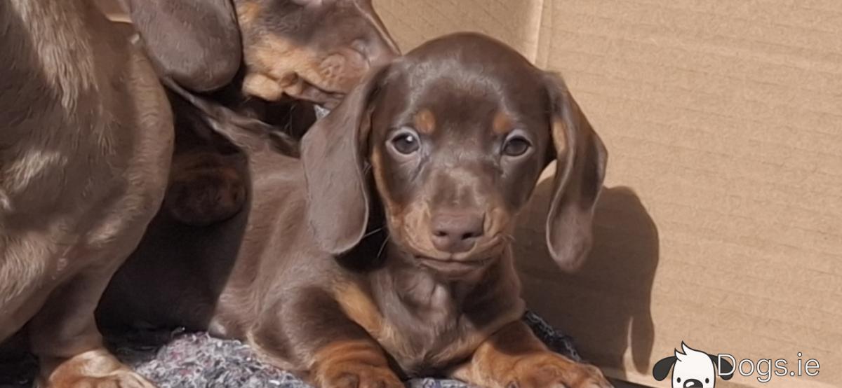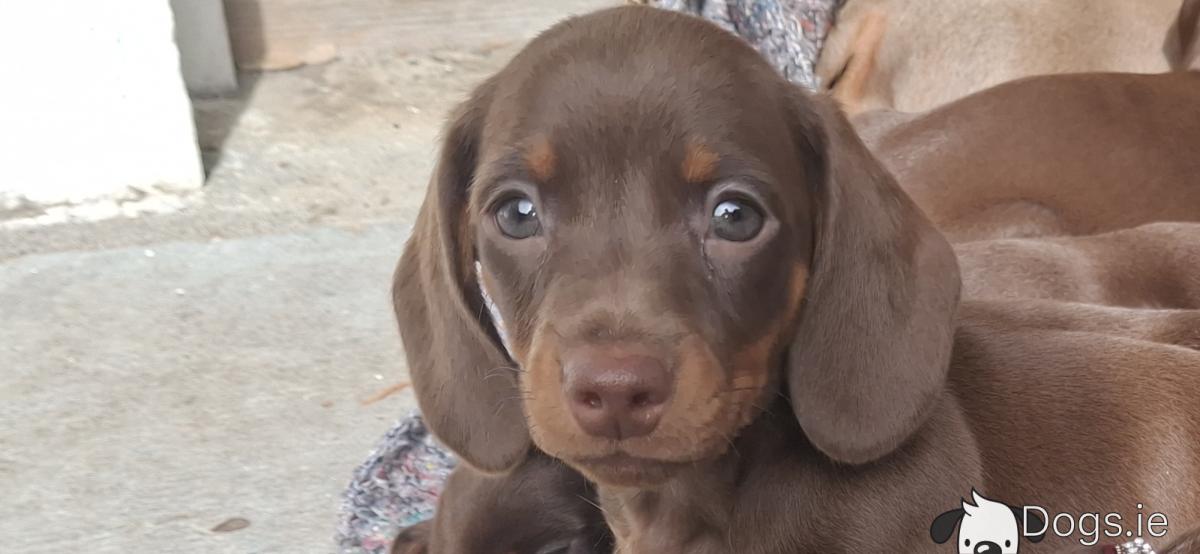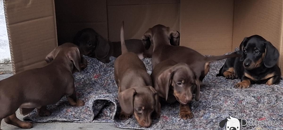 We have 6 gorgeous Dachshund puppies available - 4 girls and 2 boys. The girls are chocolate-colored, while the boys are one black & tan and one chocolate. They were born on August 2nd and are 8 weeks old. They are playful, active and very friendly.