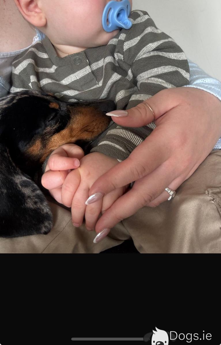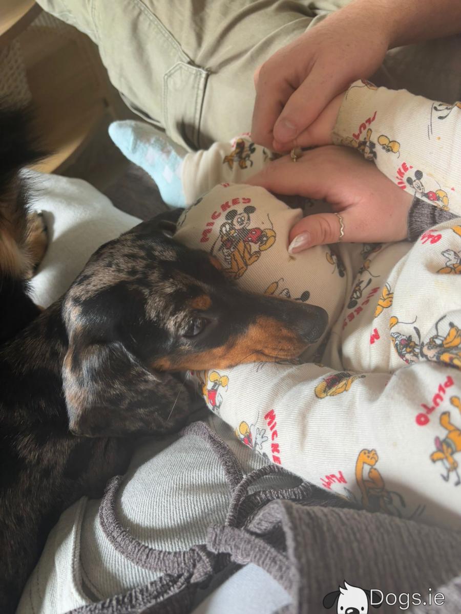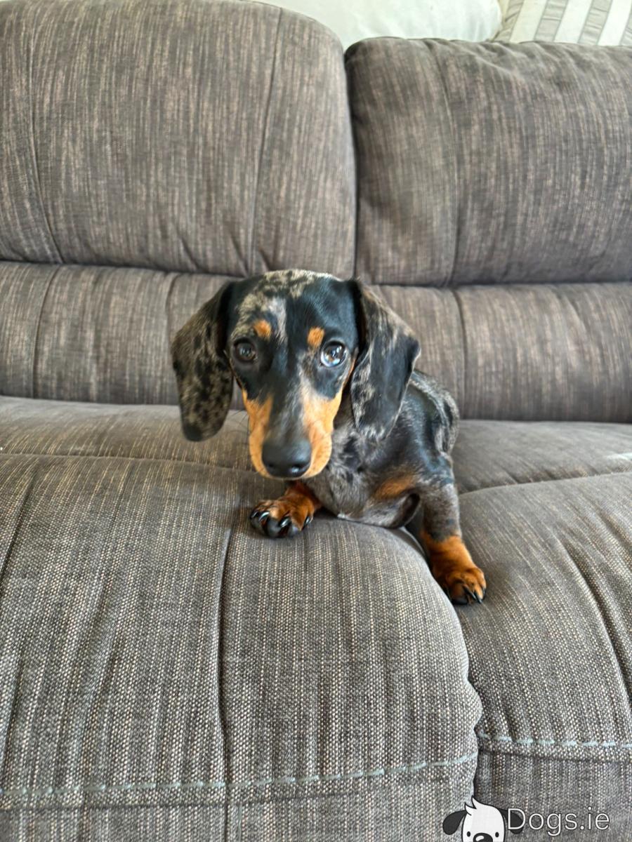 Beautiful Dapple Miniature Dachshund for sale. She is 9 months old. We are heartbroken to have to rehome her but unfortunately our baby is allergic to her. She is the sweetest puppy, her favourite thing to do is snuggle up on the couch. She is also very playful she loves to chase a ball around, and she is very gentle and good around kids. We want to make sure she gets the best home possible.