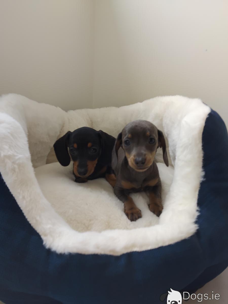 We are delighted to introduce our beautiful healthy Dachshund puppies blue girl and black and tan boy. They are smooth haired Dachshund breed known for their affectionate nature intelligence and playful personalities.