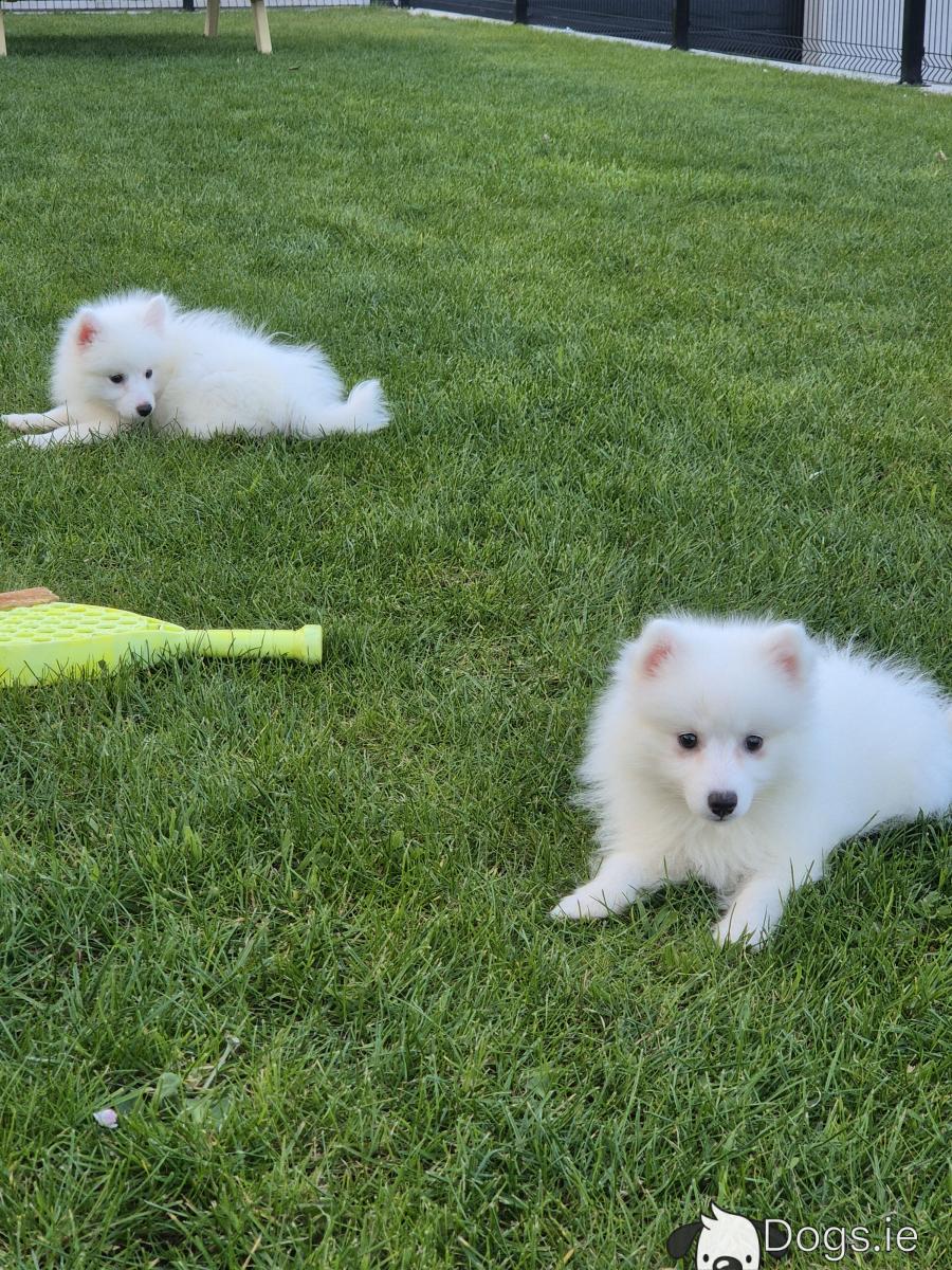 We have two absolutely stunning Japanese Spitz puppies for sale, a male and a female, both in pristine white coats. At just a few months old, these puppies have been raised in a loving family environment alongside children, ensuring they are well-socialised and friendly. Both parents exemplify the breed's characteristics, showcasing the typical playful and affectionate temperament that makes Japanese Spitz dogs such delightful companions.