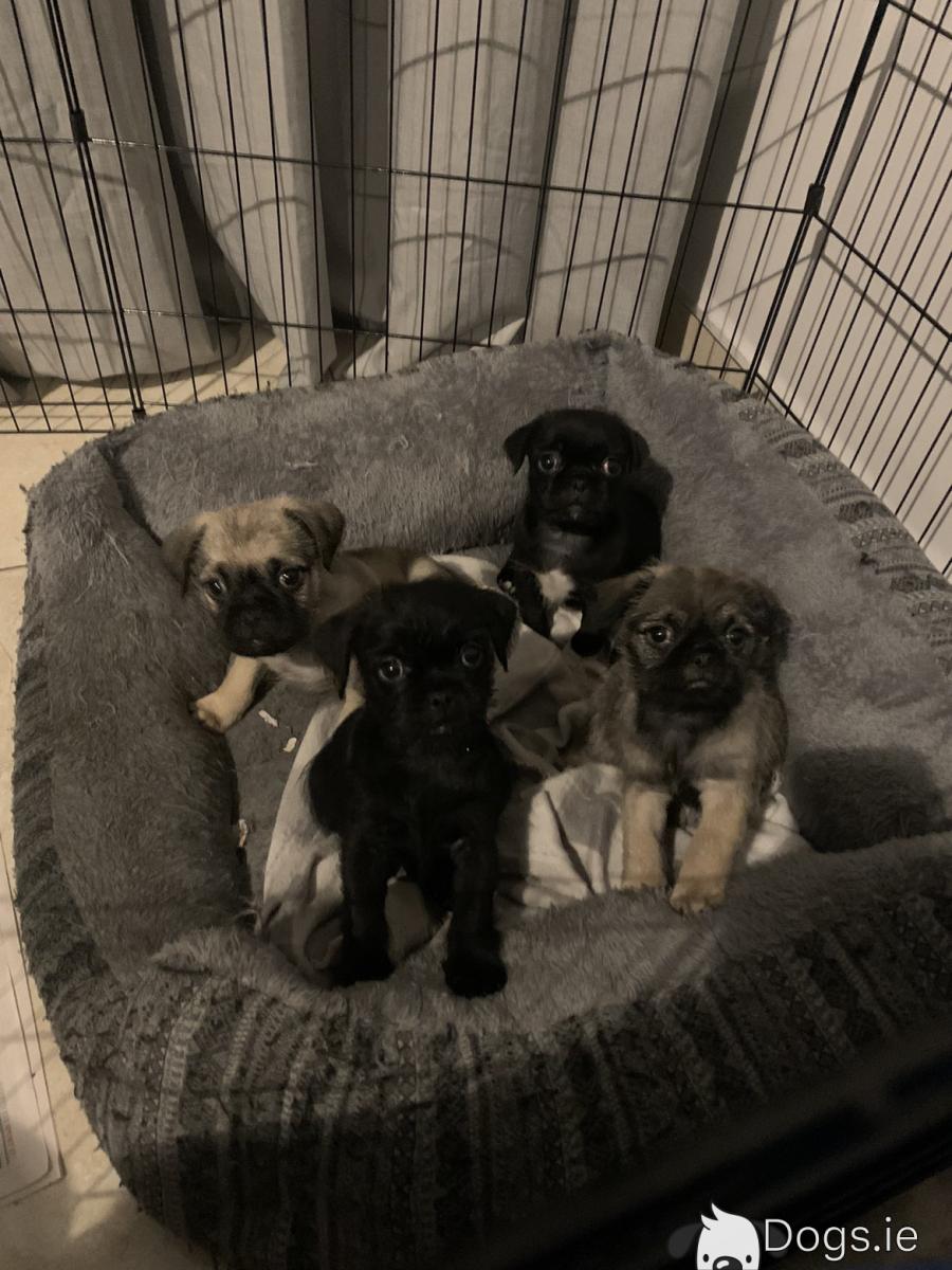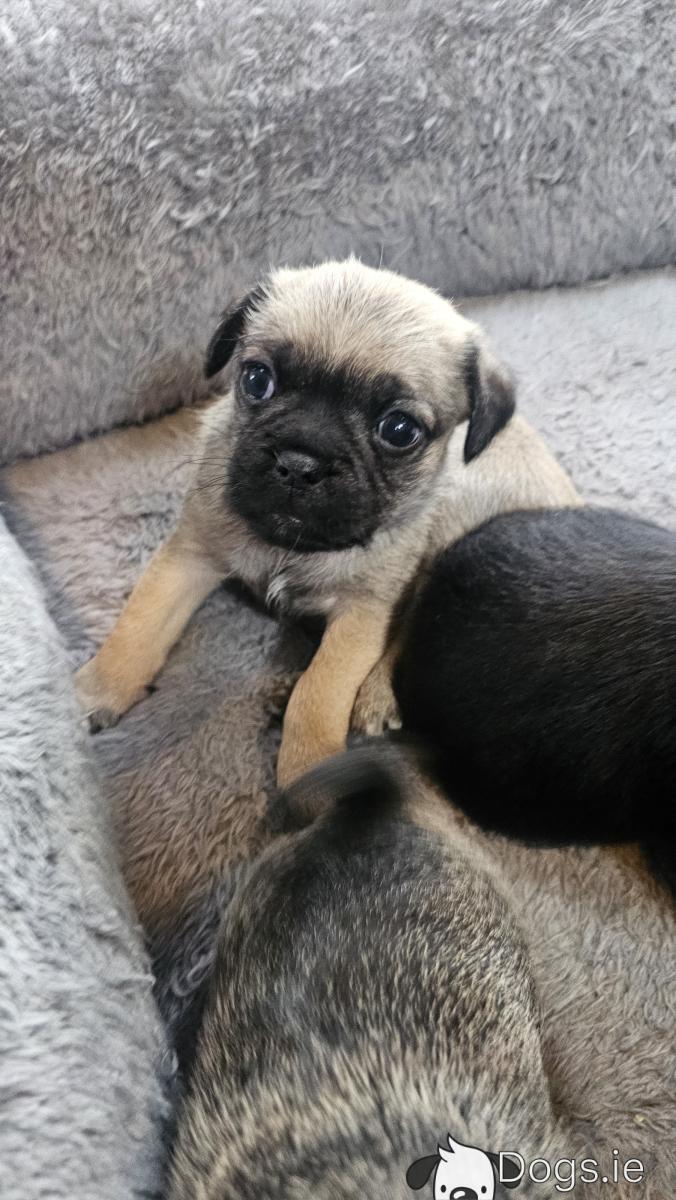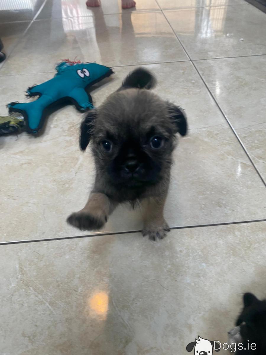 We have a delightful litter of 3/4 Pug and 1/4 Australian Terrier puppies available for sale in Tralee. At just 1.5 months old, these puppies are full of energy and curiosity, making them perfect companions for families or individuals looking for a loving addition to their home, they have been with children since birth. Each puppy has had their first vaccination and is ready to embark on their new adventures with their forever families. They got a health check with the vet and are in perfect health.