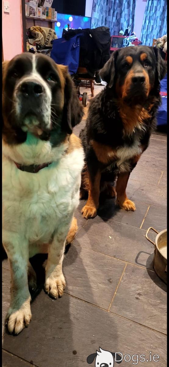 Mother is a St Bernard a lovely kind natured dog and an amazing mother. Father is a Newfoundland Bernese cross a gentle giant with a lovely personality. Currently being raised in our home with young children and cats , puppies are very gentle with both.Puppies will be available for collection at 8 weeks old.