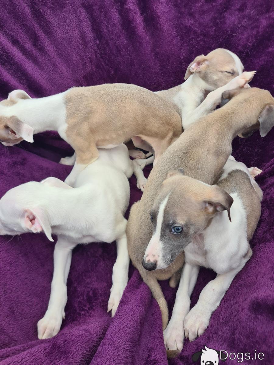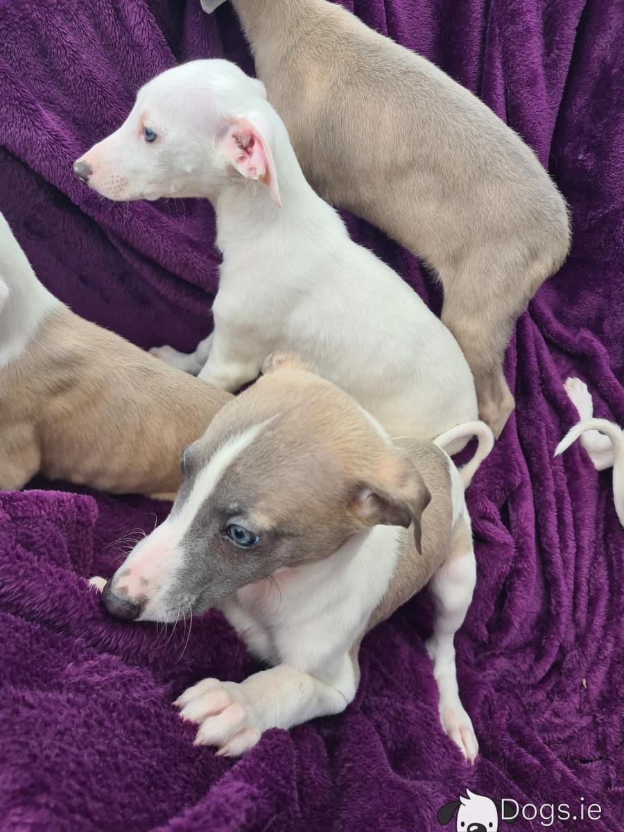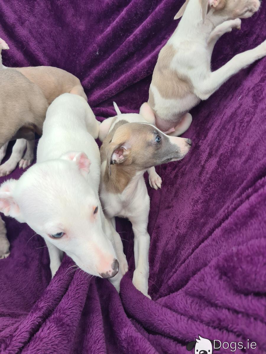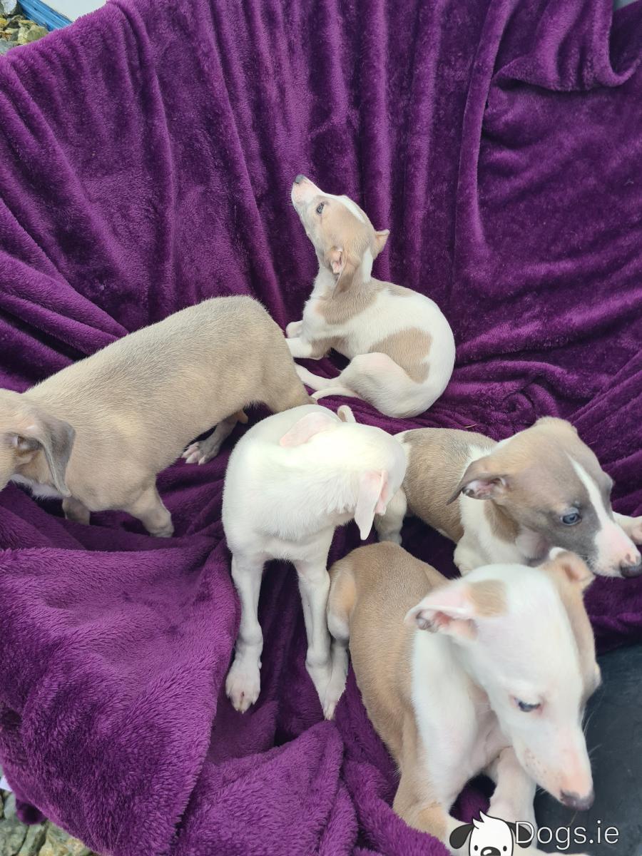 Five stunning Whippet puppies. 8 weeks old and ready for their new homes - including one rare snow-white male. All puppies come with microchip, vaccination and health certificate papers. Whippets make wonderful companions, with just the right mix of energy and affection.