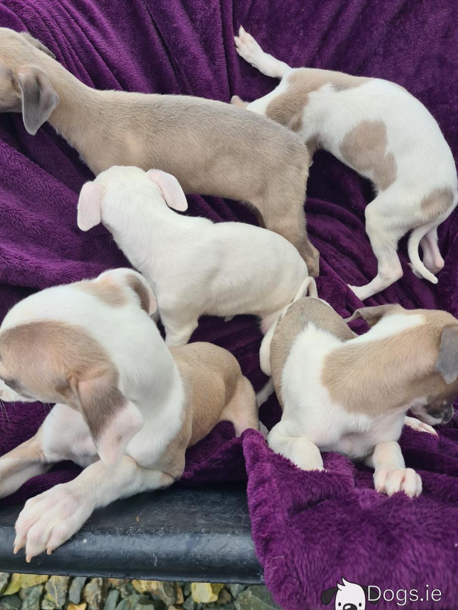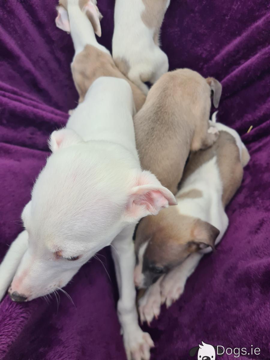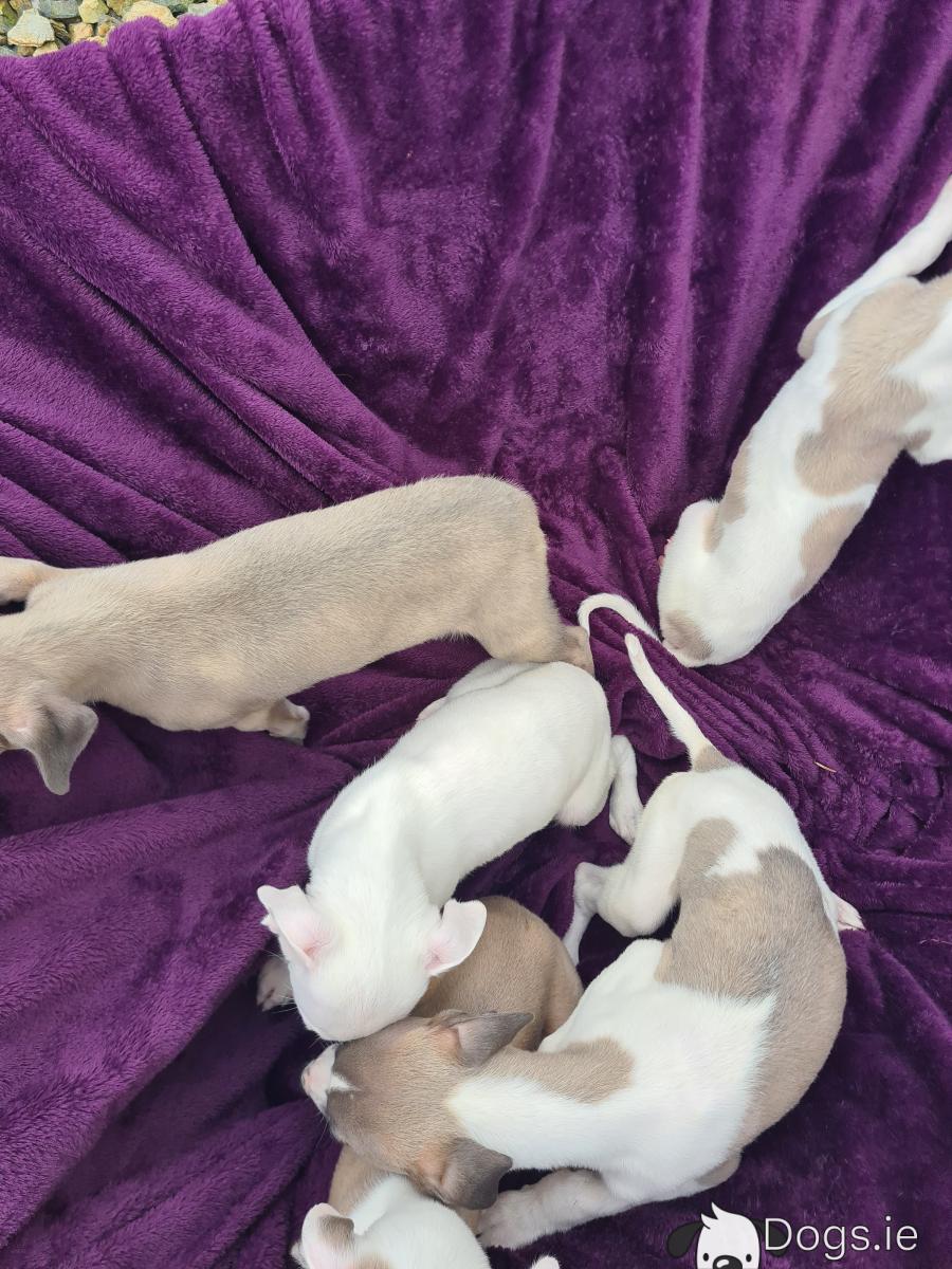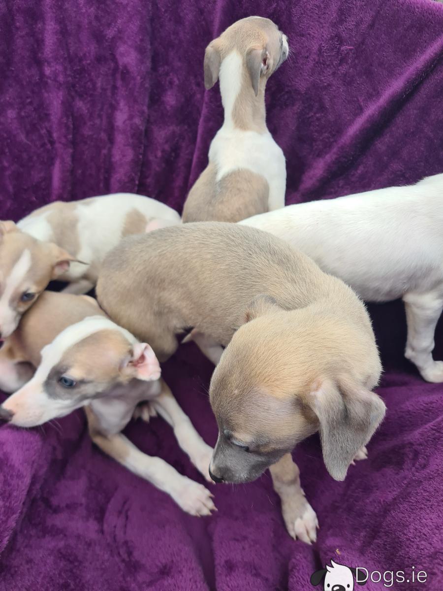 Five stunning Whippet puppies. 8 weeks old and ready for their new homes - including one rare snow-white male. All puppies come with microchip, vaccination and health certificate papers. Whippets make wonderful companions, with just the right mix of energy and affection.