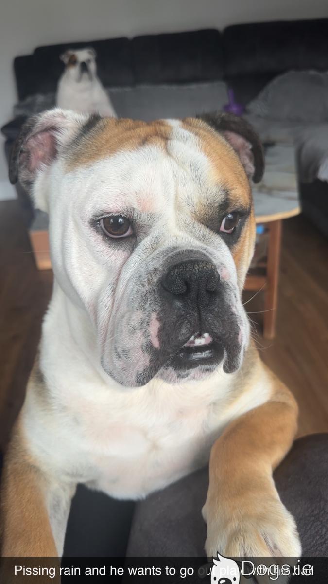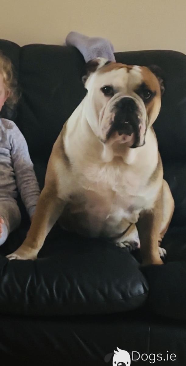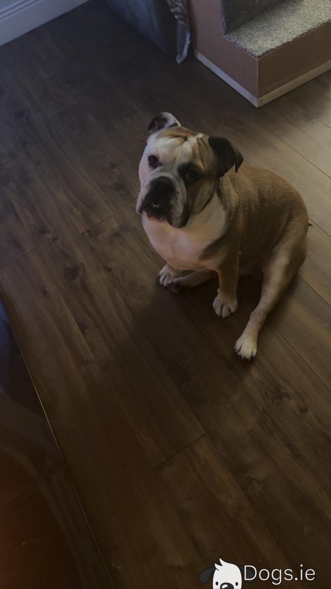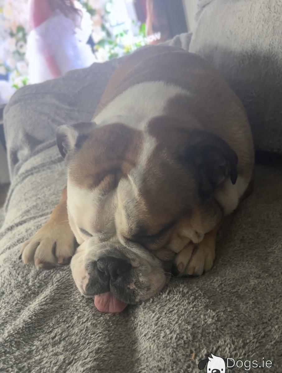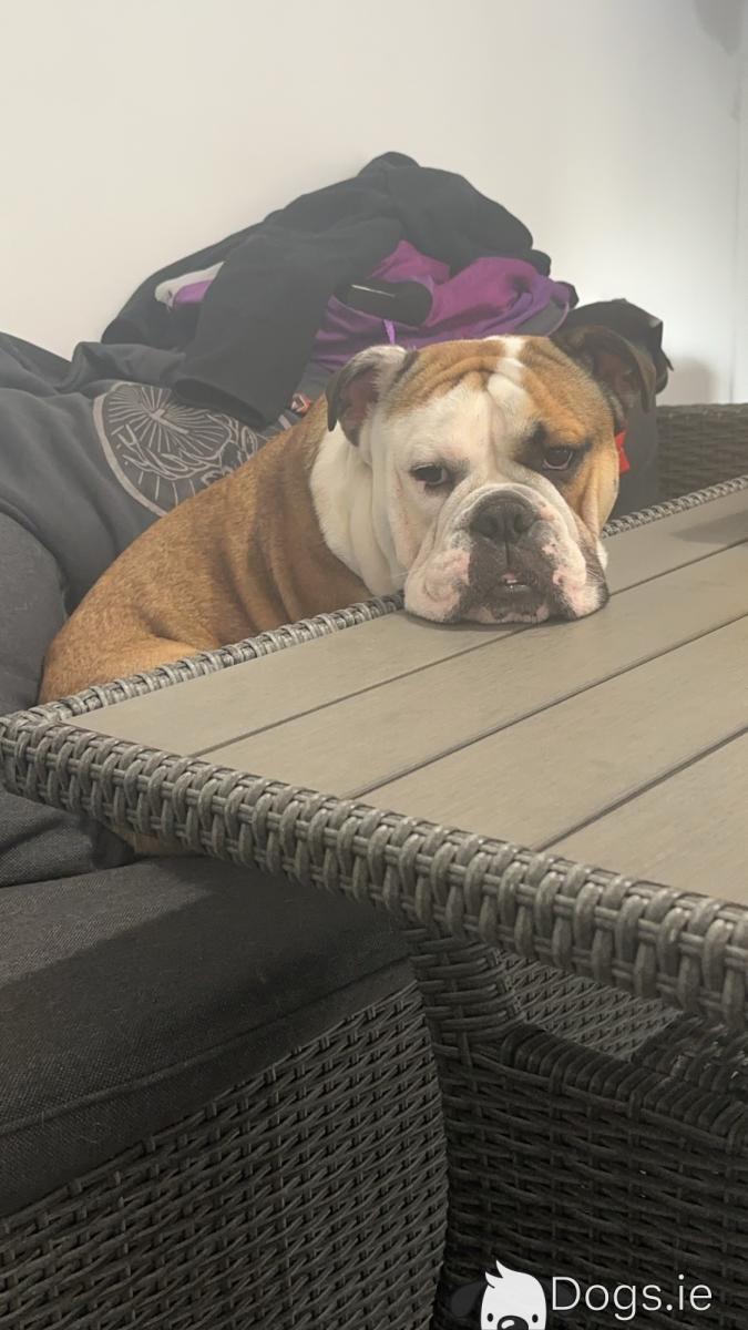 Male Bulldog for stud. He is very affectionate and absolutely loves kids and is great with them, he loves to play with kids and he is so gentle with them. I have a 3yr old niece who is obsessed with him and he is great with her also. He is also great with other dogs. He is just so playful and loves people. He loves his playtime and also loves his lazy days in front of a fire. He is extremely affectionate and loves snuggles and is just the most loveable dog and steals the hearts of anyone he meets. He loves to meet new people and will try to get them to play with him as much as he can. We also have another dog who he gets on with extremely well they play so well together and they love to snuggle together at bed time and on the couch. You know when he is tired the tongue comes out 😂 as shown in one of the photos. He has such a lovely temperament, we are absolutely besotted with him and would love for someone to be able to have puppies just like him. I can provide more photos if needed and also videos.