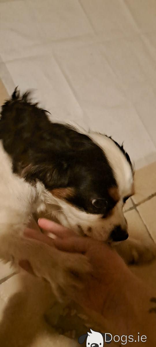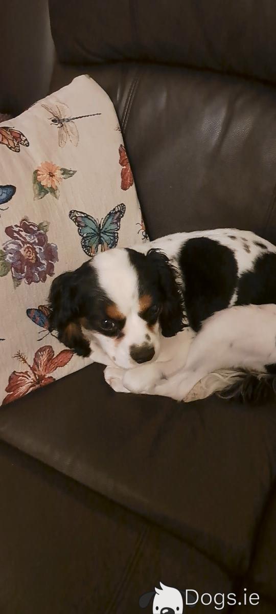 Meet Cori, a beautiful tri-coloured King Charles. Named short for corizon (heart) due to the black heart shape on his side.